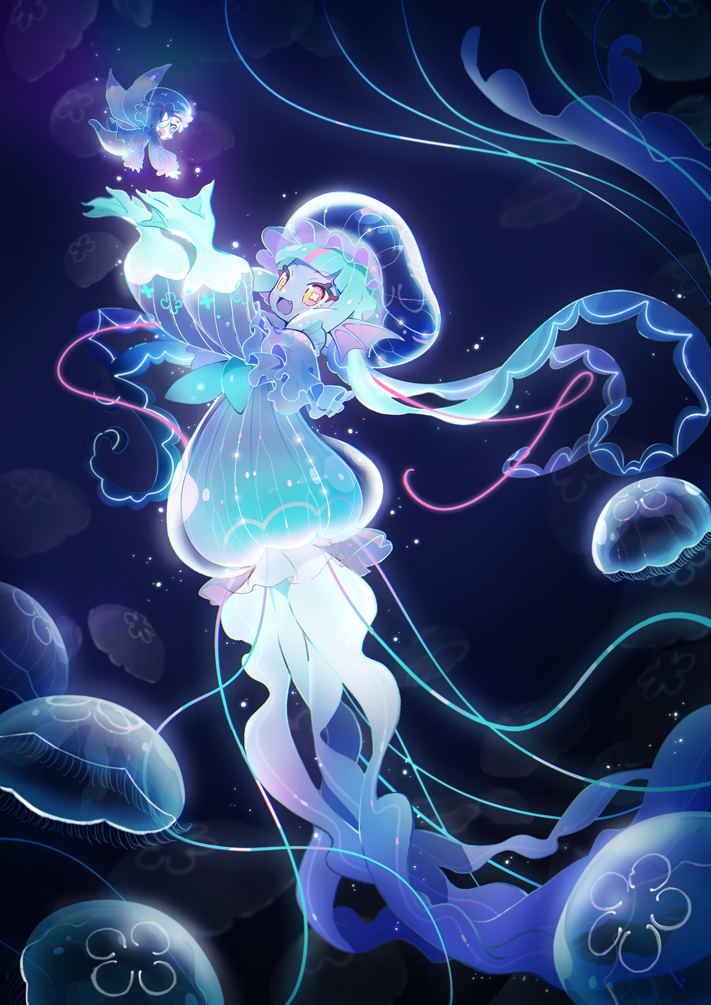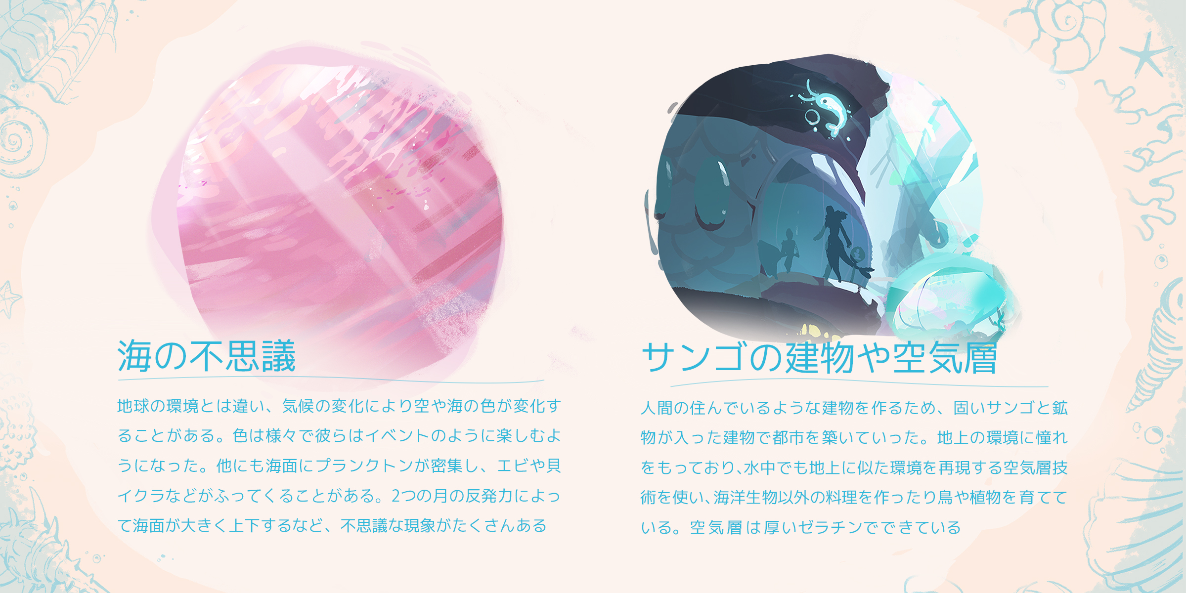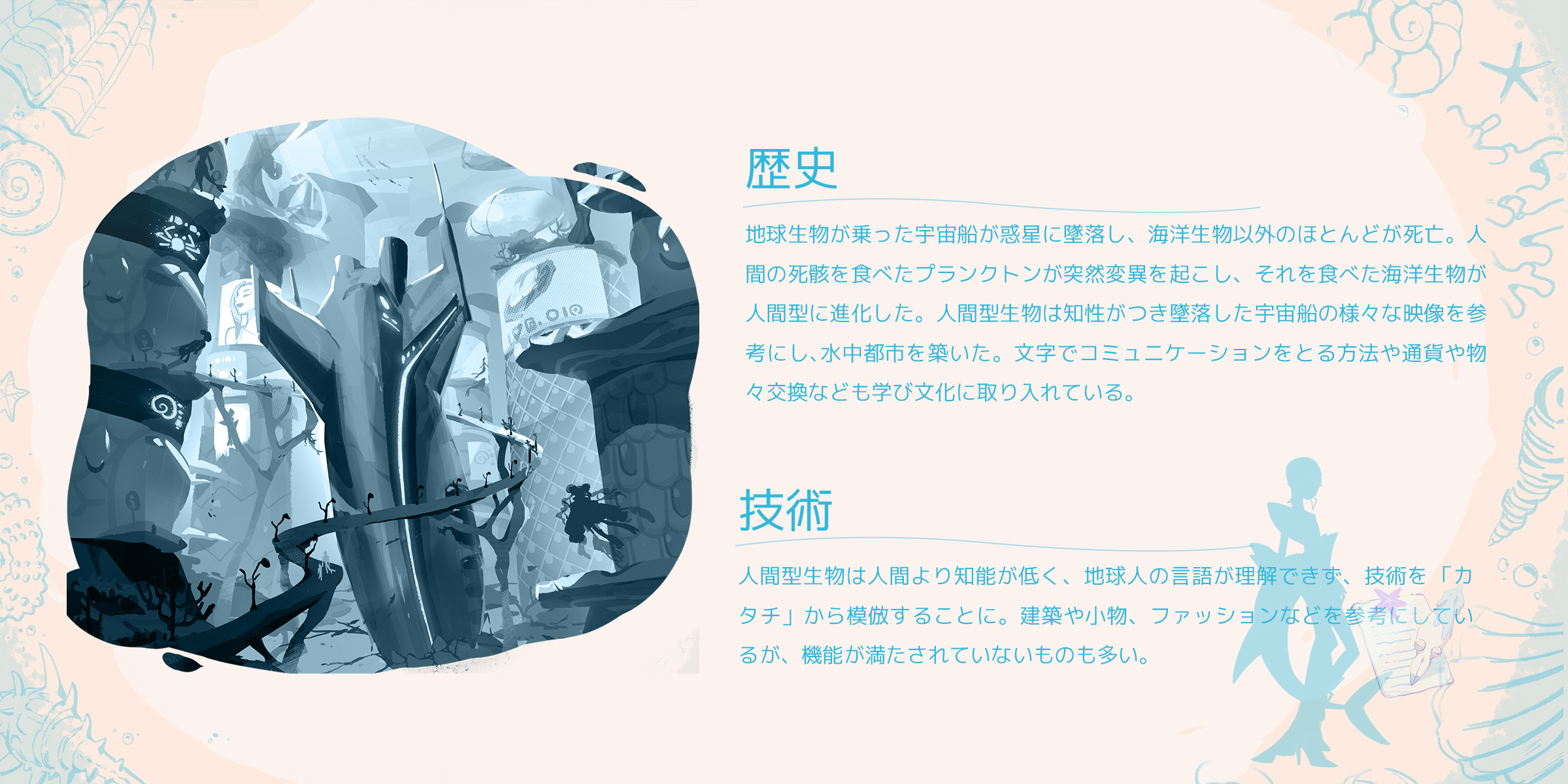 朽ち果てた宇宙船の前で、クラゲの少女とクリオネの小さなモンスターはくるくると楽しげに海中をたゆたいながらおしゃべりしています。