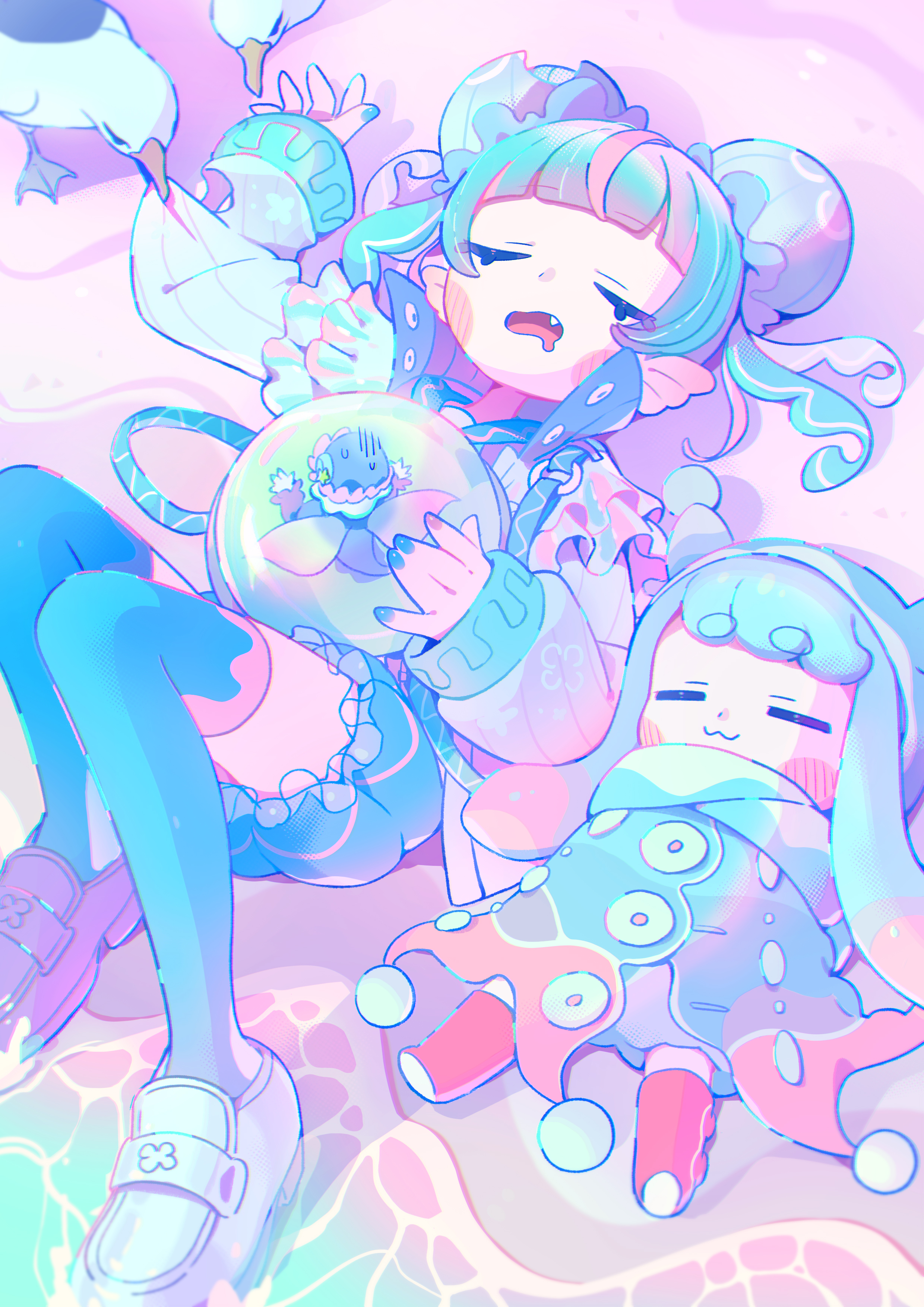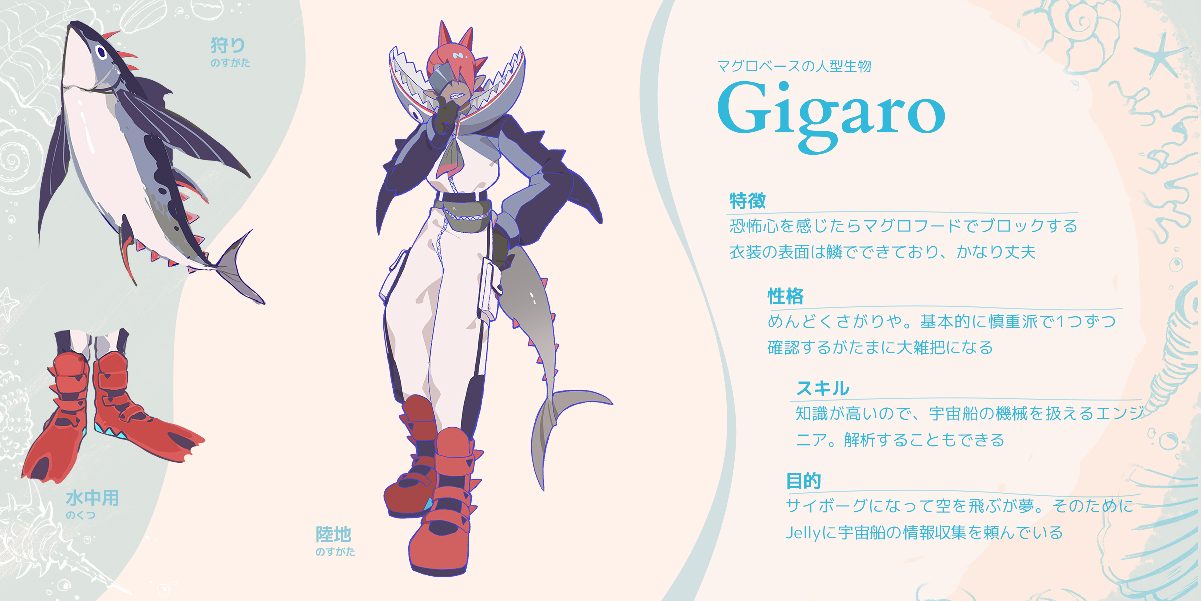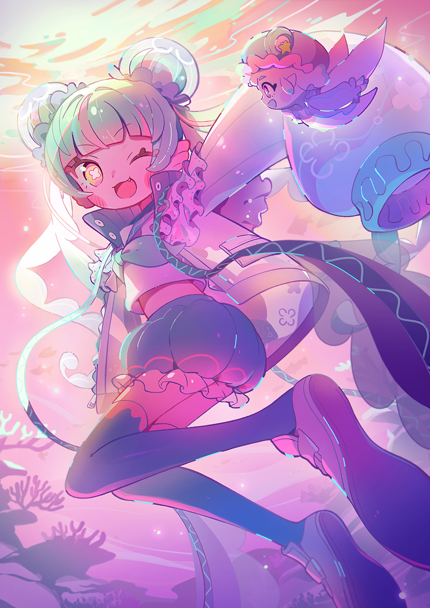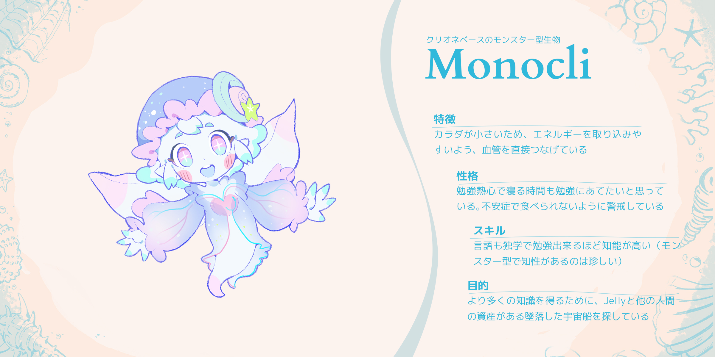 朽ち果てた宇宙船の前で、クラゲの少女とクリオネの小さなモンスターはくるくると楽しげに海中をたゆたいながらおしゃべりしています。